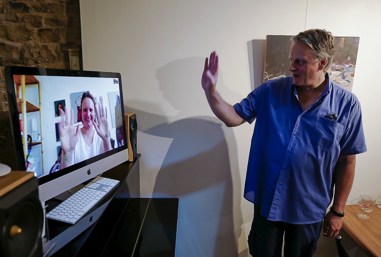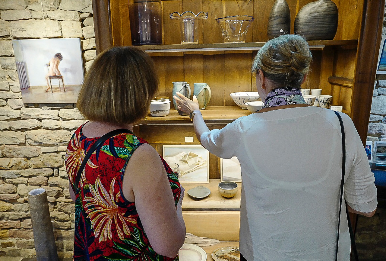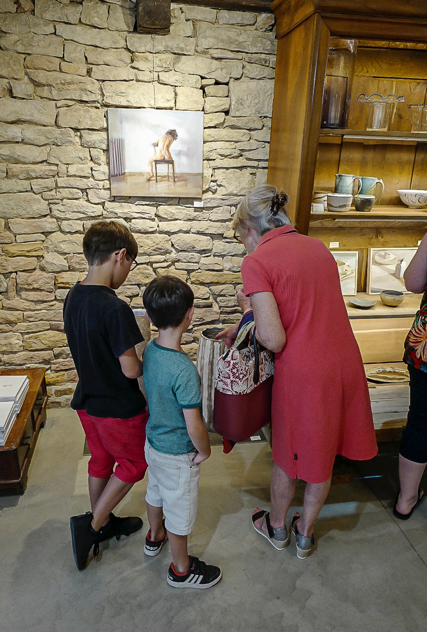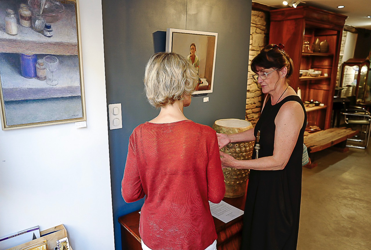Céramiste Claude Ferthet-Dugad explique son travail. À gauche une peinture du Barcelonais Pere Mon Taillant